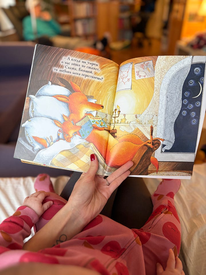 We read No Matter What by Debi Gliori in Russian. It’s a beautiful translation. Gorgeous even. A very Russian one. In the original version Small says, “But what about when you’re dead and gone – would you love me then, does love go on?” In the Russian translation Small says “when we are both dead and gone, will you stop loving me?” There was no need to change “you” for “we,” the rhyme would have worked either way. I go down the rabbit hole and find out that for American version the text was changed to “And if you are far away, love disappears or remains?”