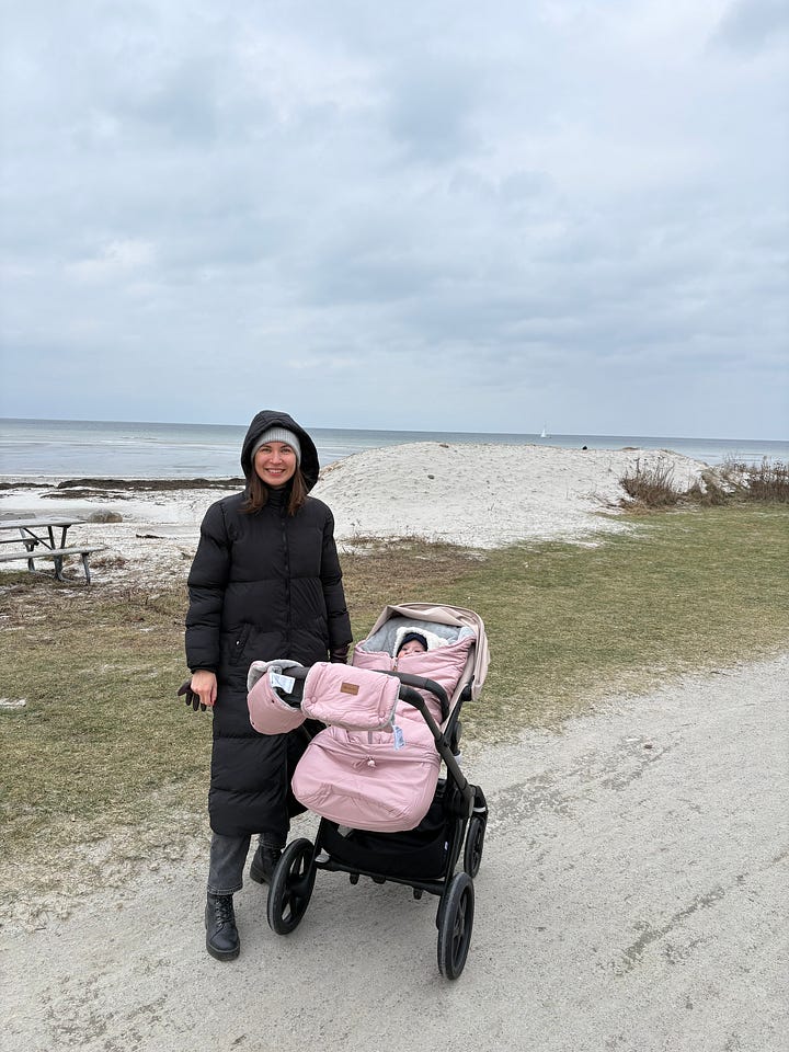 It’s cold out here. The wind is merciless, and the shallow parts of the sea are covered in ice. We go on long walks—Bean bundled up in a stroller, in a ski suit and a footmuff—and I, desperately gripping the hood of my coat with my frozen hands. She sleeps well outside.